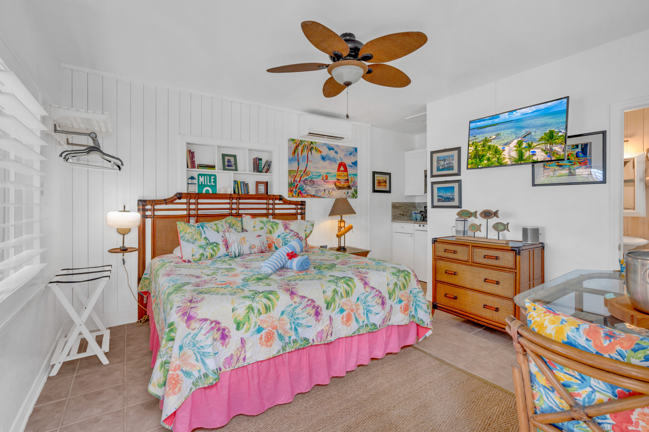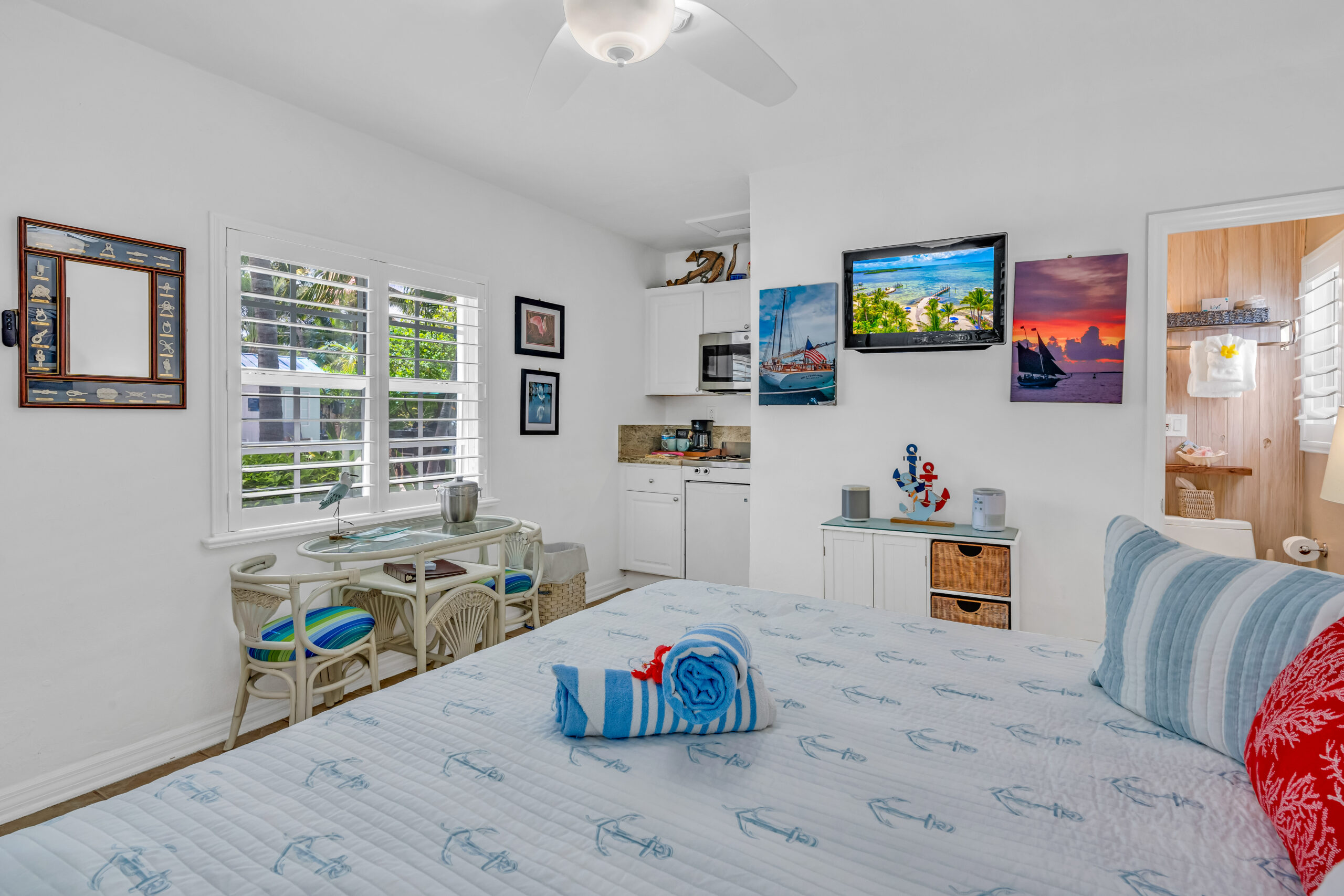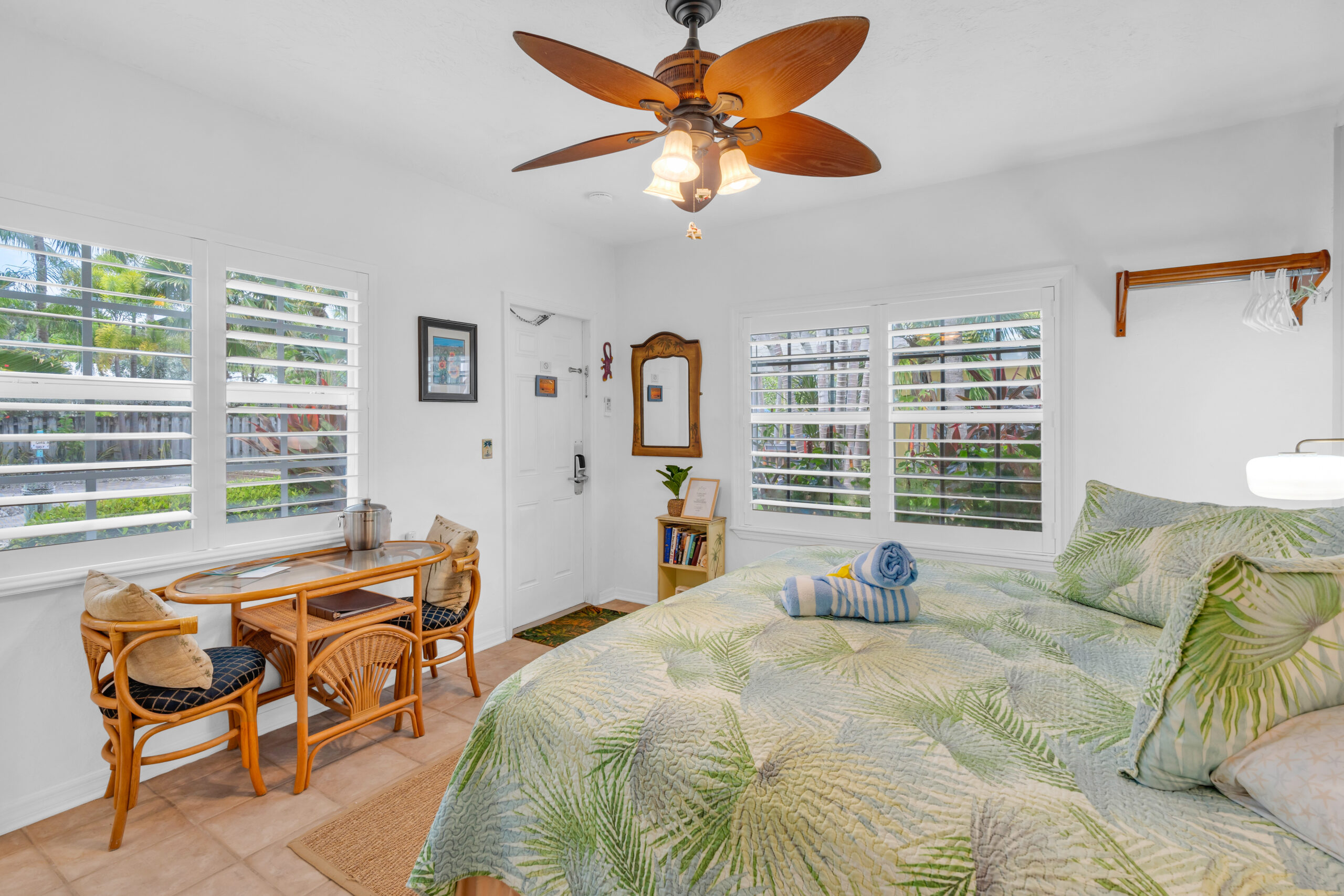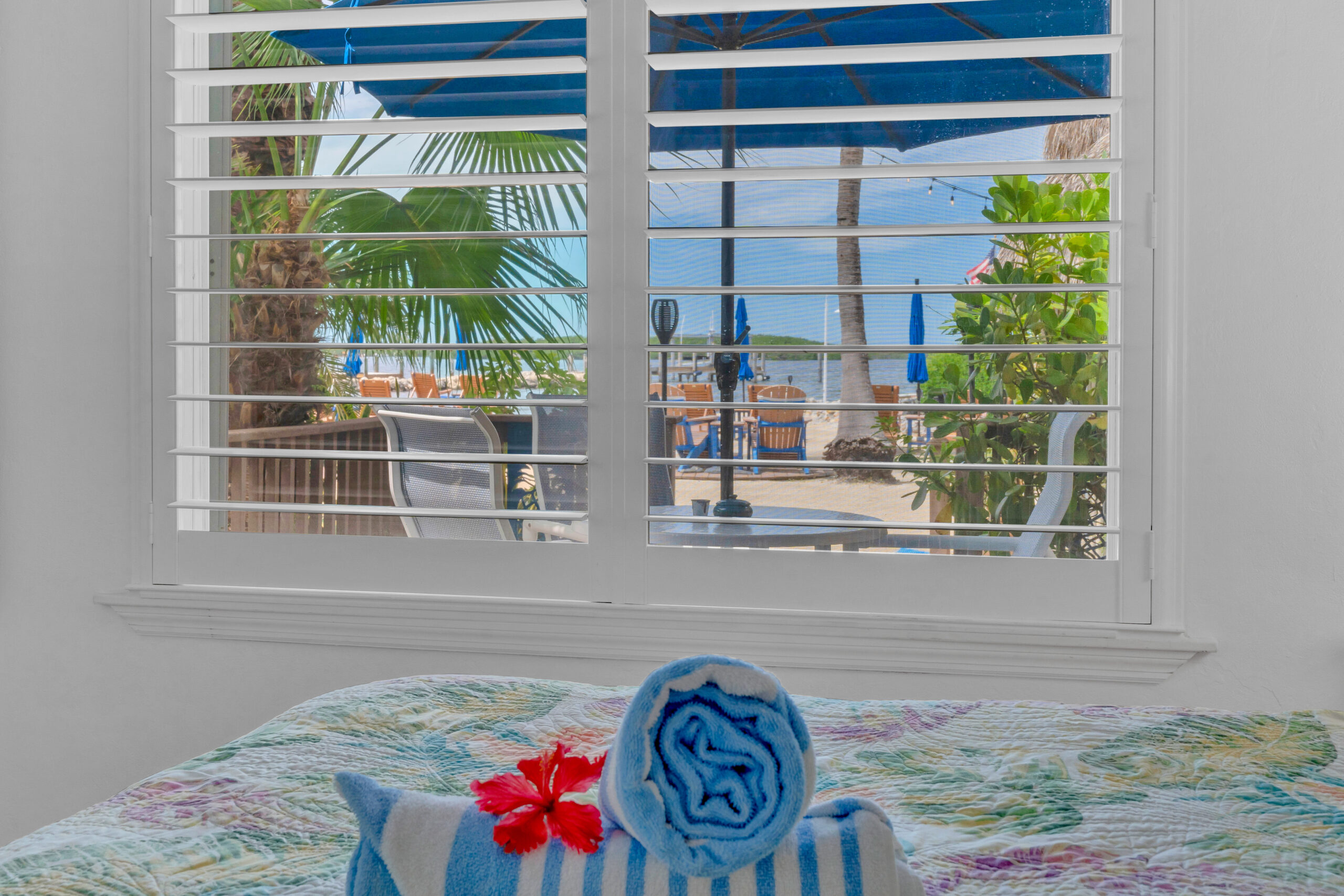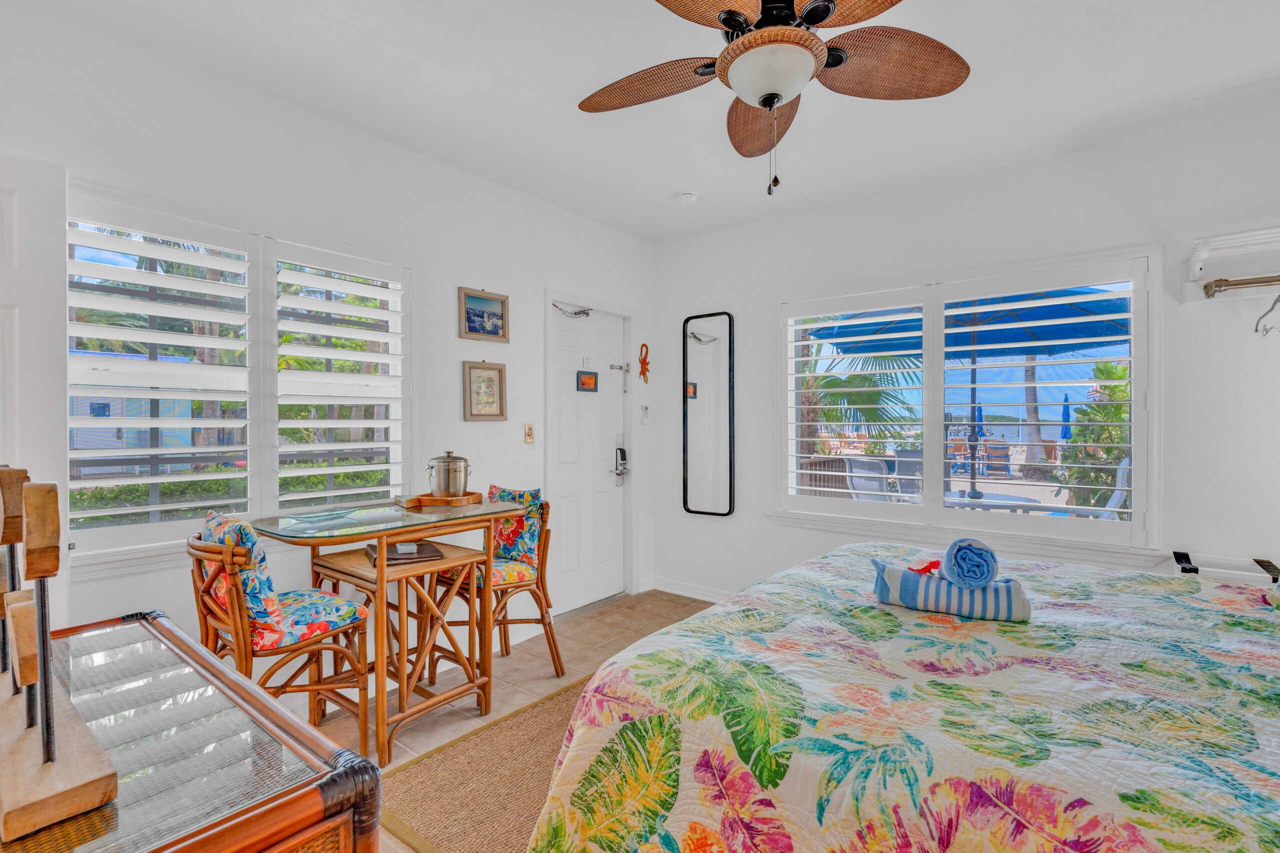 Outside, your own private deck awaits, complete with an umbrella-shaded dining area—ideal for enjoying a morning coffee or evening meal under the palms. Just steps from your door, lush tropical gardens and meticulously maintained grounds lead you to the waterfront, where kayaks, paddleboards, and other beach gear are always available to use, free of charge.