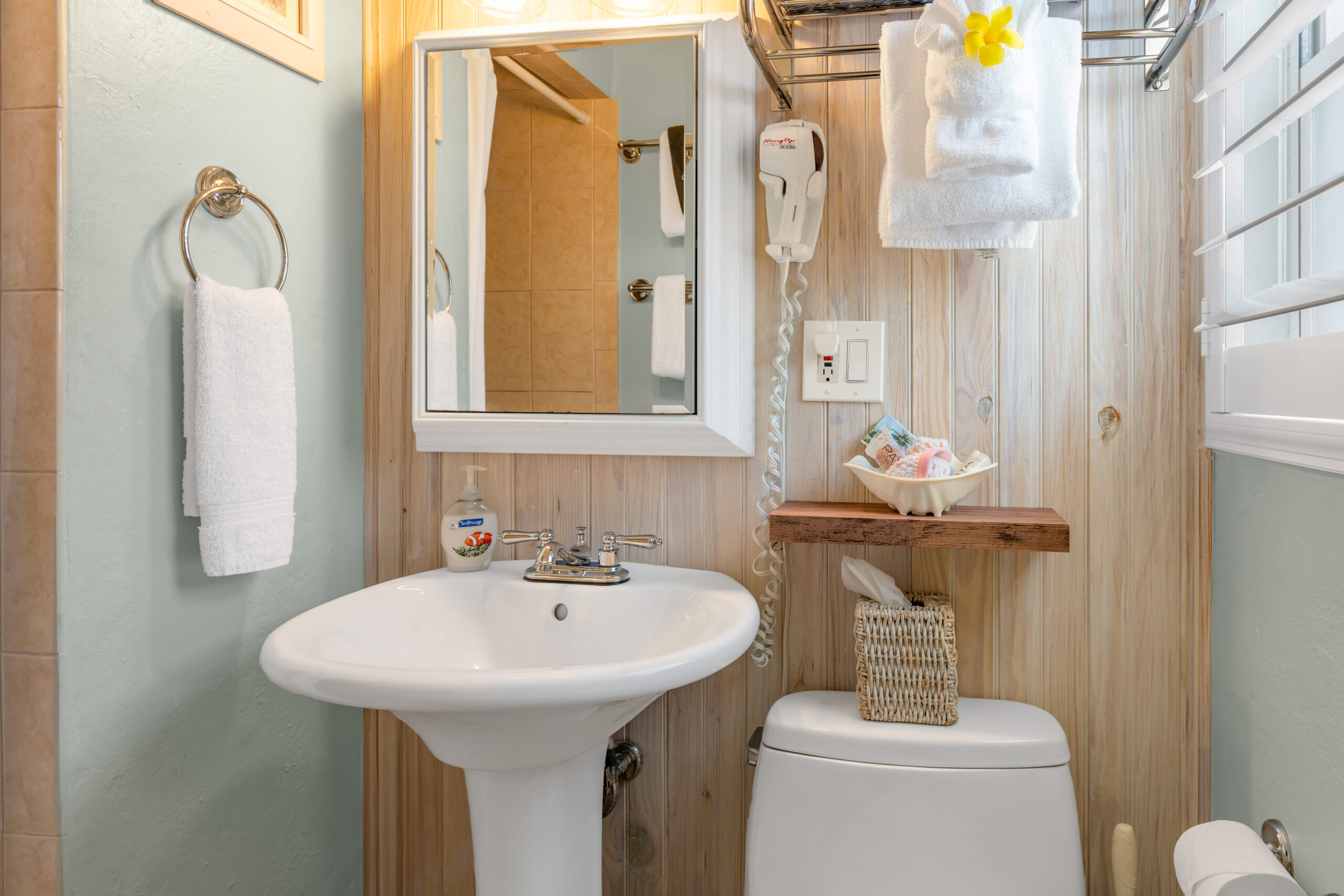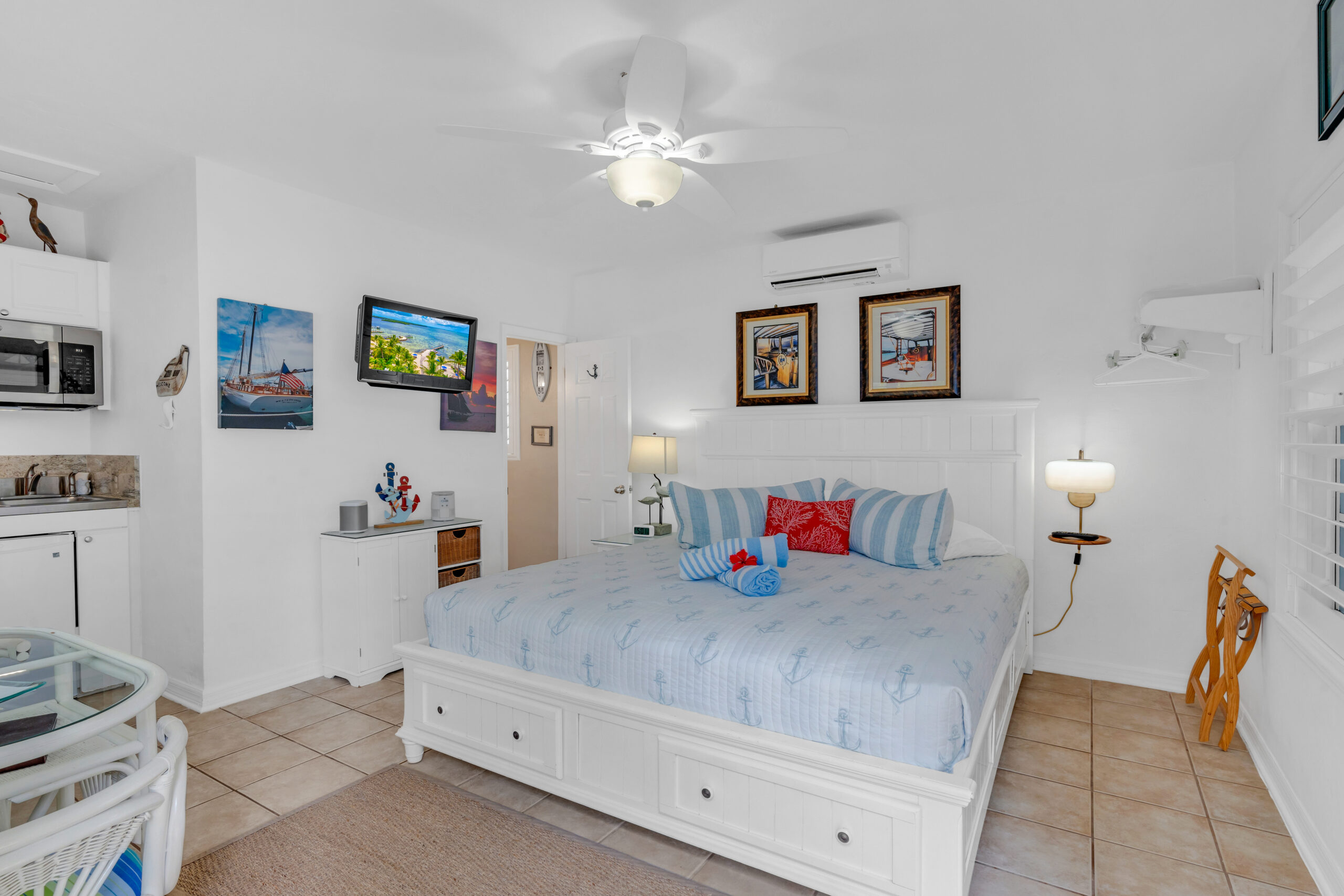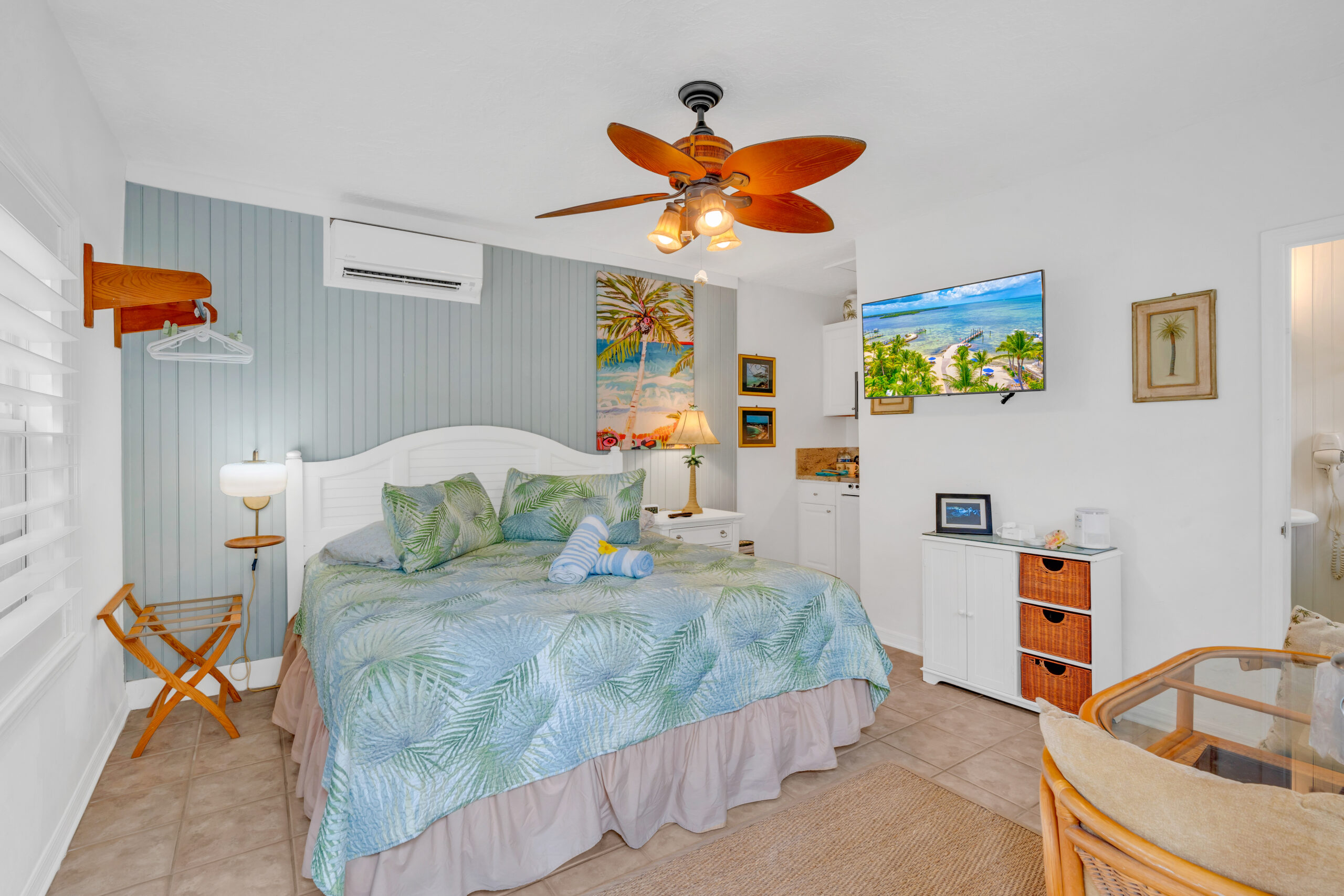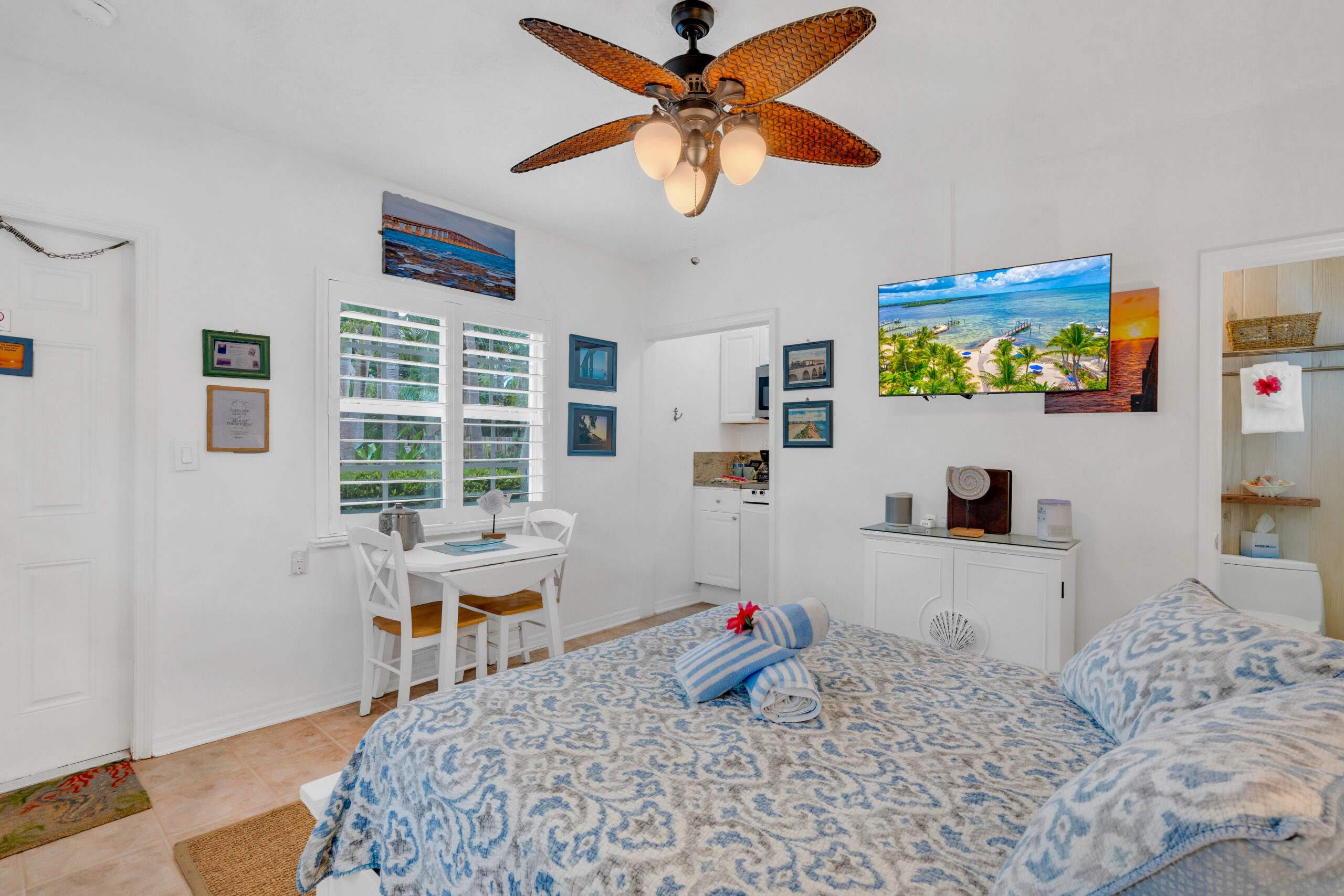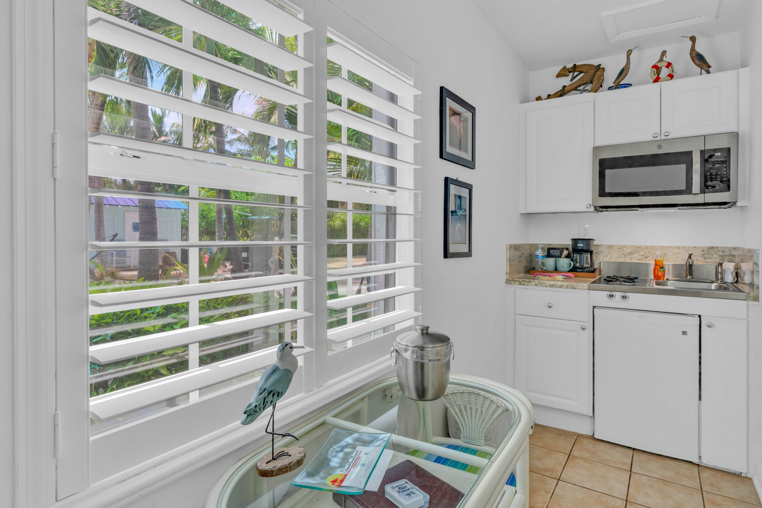 Outside, your own private deck awaits, complete with an umbrella-shaded dining area—ideal for enjoying a morning coffee or evening meal under the palms. Just steps from your door, lush tropical gardens and meticulously maintained grounds lead you to the waterfront, where kayaks, paddleboards, and other beach gear are always available to use, free of charge.